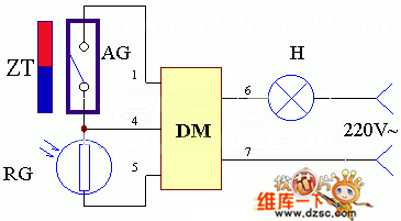 白天由于光照較強,光敏電阻RG的內阻很小,即使AG閉合,R與RG的分壓也小于1.6V,故白天打開大門,H是不會點亮的。夜晚相當于RG兩極開路,故控制器DM的④端電壓高于1.6V,H點亮。RG可用MG45-32非密封型光敏電阻,AG可作Φ3-4mm的干簧管(常閉型)。