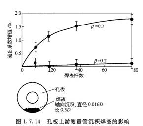 圖1.7.14和圖1.7.15所示為孔板上游側(cè)測(cè)量管底部沉積臟物對(duì)流出系數(shù)的影響。