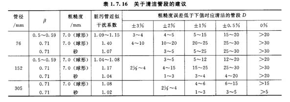 表1.7.16所示為管壁清除臟物(結(jié)垢),使粗糙度降低后改善流出系數(shù)測(cè)量誤差的情況。由表可見,在節(jié)流件上游側(cè)附近一段管道清除污物可以顯著提高流出系數(shù)的測(cè)量精度。對(duì)于大口徑管道(DN>300),清洗的管段可以顯著縮短。