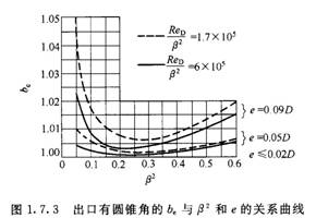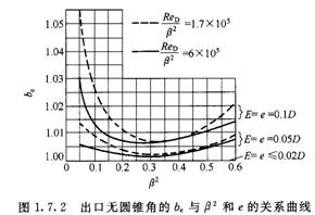 孔板開孔圓筒形部分長(zhǎng)度e不論其出口是否有圃錐角,均應(yīng)小于或等于0.02D.對(duì)角接取壓標(biāo)準(zhǔn)孔板,當(dāng)e>0.02D時(shí),應(yīng)進(jìn)行修正,其修正系數(shù)為be.be與ReD無(wú)關(guān),僅與e和B2有關(guān)。但是,出口有圓錐角的孔板和無(wú)圓錐角的孔板,其be值是不同的,如圖1.7.2和圖1.7.3所示。這兩張圖可采用線性內(nèi)插,但不得外推。