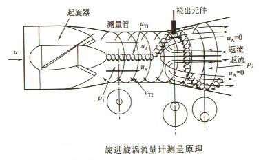 受周圍約束,旋流通過截面積擴大的管段時,產生旋渦旋進流動,即旋渦中心軸作進動,進動頻率與流體流速成正比。因此根據進動頻率確定流體流量。