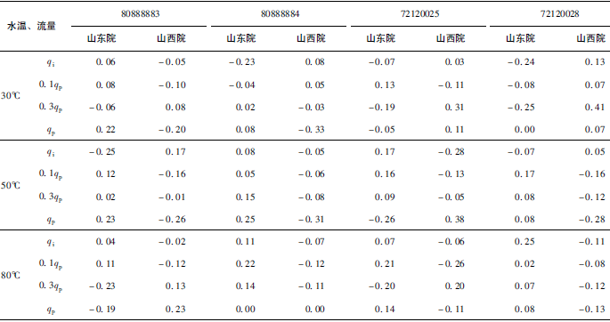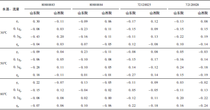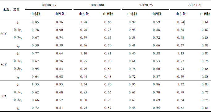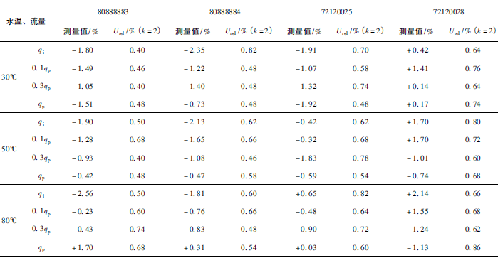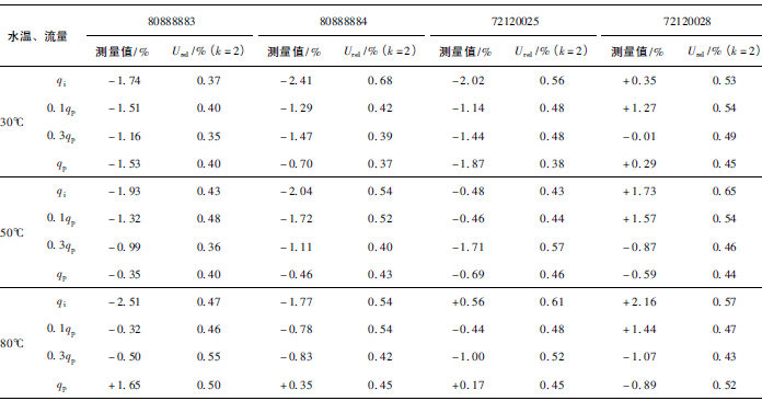 (3)累積體積(標準表法)相對示值誤差測量結果中,山東院在水溫30℃、qi點處與參考值的差值最大,為+0.31%(80888883);山西院在水溫80℃、qp點處與參考值的差值最大,為-0.24%(72120028)。同樣在標準表法中比對樣品在一些試驗點上的測量重復性也不是很好,差值的擴展不確定度最大達到了1.41%。