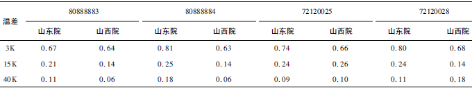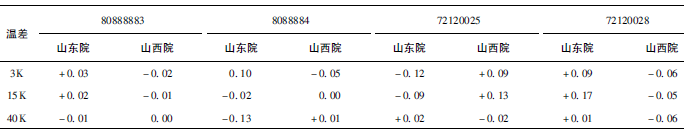 (1)熱量相對示值誤差測量結果中,兩院在15K點處與參考值的差值最大,山東院為+0.17K(72120028);山西院為+0.13K(72120025)。由于3K溫差對相對誤差來說要求較高,所以差值的擴展不確定度也較大,為0.63%~0.81%。