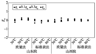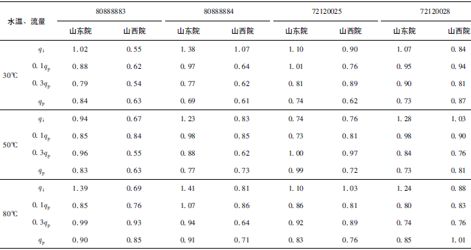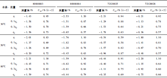 (2)累積體積(質量法)相對示值誤差測量結果中,山東院在水溫80℃、qi點處與參考值的差值最大,為+0.31%(72120025);山西院在水溫30℃、0.3qp點處與參考值的差值最大,為+0.36%(72120028)。由于比對樣品在一些試驗點上的測量重復性不是很好,差值的擴展不確定度最大達到了1.35%。