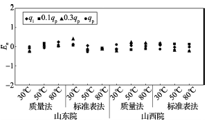 根據國家計量檢定規程JJG225―2001《熱能表》,熱量表的檢定方法有總量檢定法、分量檢定法和分量組合檢定法等三種,要求的試驗水溫為(50±5)℃。由于兩參比實驗室均為國家型式評價授權實驗室,不僅承擔著檢定工作還要承擔型式評價試驗任務,所以本次比對采用的方法為分量法(流量傳感器)和分量組合法(配對溫度傳感器和計算器)。比對中,試驗水溫分別為室溫(30℃±3℃)、(50℃±3℃)、80~85℃;流量比對采用質量法和標準表法,比對點分別為qp(1-2.5%)、0.3qp(1±2.5%)、0.1qp(1±2.5%)、qi~1.05qi,共計四個比對點(qp為常用流量;qi為最小流量);熱量比對采用配對溫度傳感器和計算器組合法,出口溫度θd=(40±1)℃,模擬流量為0.3qp(1±2.5%),溫差為Δθmin≤Δθ≤1.2Δθmin、14.5℃≤Δθ≤15.5℃、39.5℃≤Δθ≤40.5℃,共計三個比對點。每個比對點進行6次試驗,取其平均值作為比對結果。
